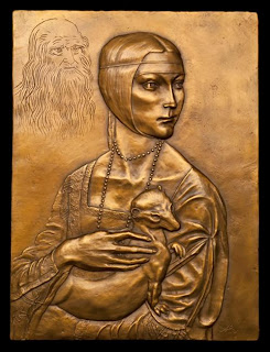 Of the thousands of pieces on exhibit, the portrait of Cecilia Gallerani - The Lady with Ermine - will catch your attention - this is a piece that Alex Palkovich recently used in challenging himself to creating a relief. (Leonardo's work is above to the left, Alex's to the right.) More info about Leonardo LIVE.